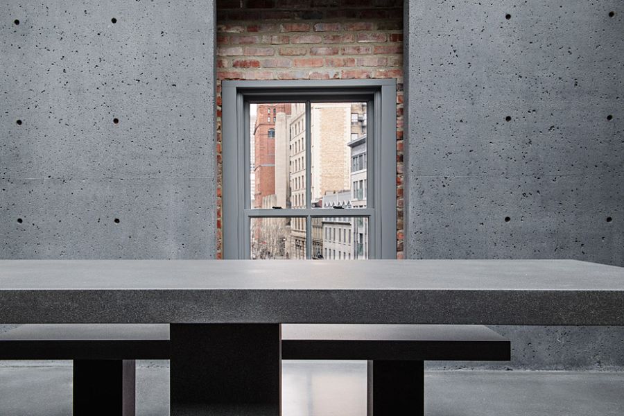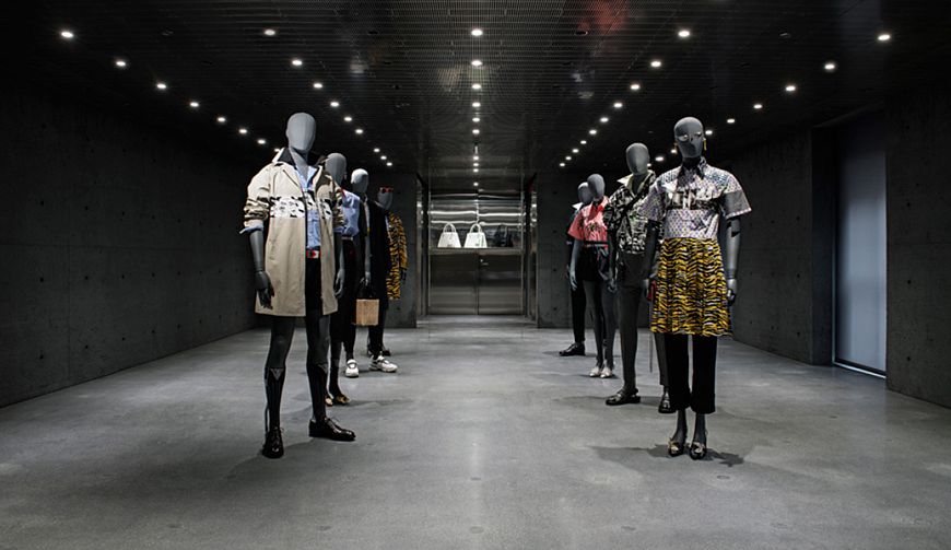 Заметные изменения претерпела входная группа магазина. Так, размер центральной двери стал 3, 5х1, 85 м. На верхнем этаже появилось дополнительное мансардное окно. Но внимание посетителей будет сконцентрировано, разумеется, на интерьере. Во флагманском бутике принцип торговли несколько отличается от привычных стандартов. Например, покупатели сначала выбирают на сайте модели, а затем приезжают, чтобы примерить их на месте. Именно поэтому третий и четвертый этажи отведены под примерочные комнаты с большими шкафами. Склад компании находится в подвале, который соединен со всеми уровнями специальным лифтом для транспортировки одежды. В пространстве магазина демонстрируется лишь небольшая часть коллекций. Для демонстрации использованы стеклянные витрины и полки из нержавейки, закрепленные на растяжках между потолком и полом. Еще одна особенность дизайна – отлитая на заказ массивная бетонная мебель.