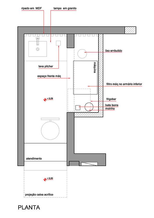 Площадь помещения составляет 3,95 кв. м. Раньше здесь был склад соседнего ресторана, но потом администрация заведения решила отказаться от этой функции и сдать четыре «квадрата» в аренду. В процессе обустройства кафе, где кофе в основном продают «на вынос», архитекторы вдохновлялись лучшими образцами японского минимализма. Главный вопрос, который встал перед ними, - как визуально выделить на фасаде новое заведение? Проектировщики приняли решение обозначить его вертикальными линиями, цветом и рекламной светящейся конструкцией из акрила. В интерьере внешний вид фасада поддерживается теми же металлическими вертикальными рейками и деревянной отделкой, а также черными фаянсовыми плитками, которыми часто облицовывают стены в вестибюлях бразильского метро. Таким образом и кафе, и бариста и клиенты стали частью городской атмосферы и повседневной жизни мегаполиса, а само заведение – интерактивным общественным пространством.