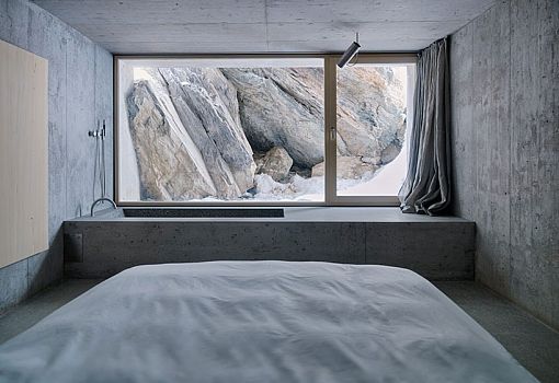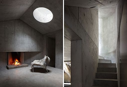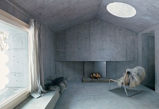 Сельская местность округа Флимс (Швейцария) усеяна старыми деревянными домиками. Дерево, как известно, материал недолговечный. Однако швейцарское бюро «Nickisch sano walder architekten» разработало проект небольшого дома, сохранившего все преимущества бревенчатого, но выполненного из бетона. Внешние стены отлиты таким образом, что воссоздают форму бревен. Внутри жилища архитекторы также постарались сохранить исторически сложившиеся традиции. В основной комнате наверху есть очаг, небольшая обеденная зона расположена у окна с видом на близлежащий лес. Круглое окно на крыше пропускает внутрь много света, а в большое окно спальни почти «врывается» живописный кусок скалы.