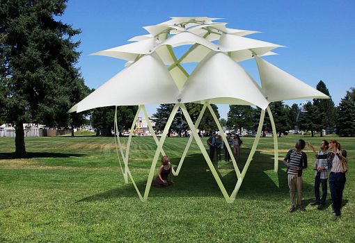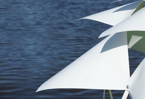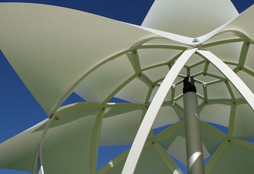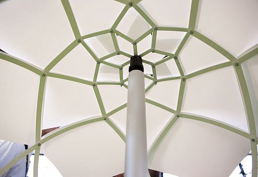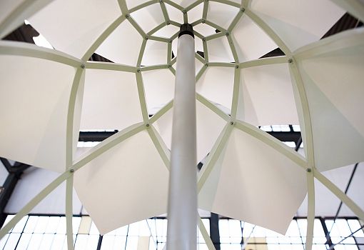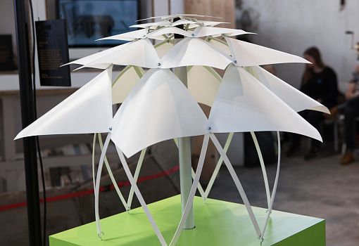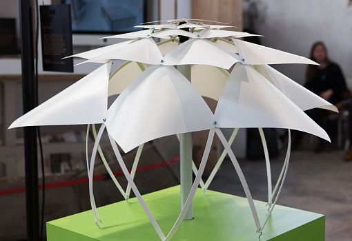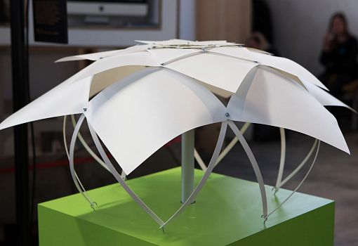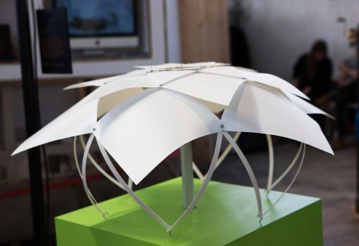 Рианне Маст (Rianne Mast), выпускница прошлого года Утрехтской школы искусств (HKU), разработала проект интерактивной беседки White Sun. Это динамическая архитектурная конструкция, конфигурация которой меняется в зависимости от внешних погодных условий. Крыша павильона представляет собой структуру из частично заходящих друг на друга ромбов и очень напоминает своим строением шишку. Сходство это не случайное: идея павильона созрела у дизайнера в ходе курса биомиметики – науки по изучению строения и функционирования биологических систем как потенциальных моделей для проектирования и инженерии. Маст положила в основу конструкционных расчетов последовательность Фибоначчи, которая описывает строение множества природных структур: спиральное развитие семечек в подсолнухе, лепестков у цветка, чешуек шишки и ананаса, листорасположение и т.д. Выполненные  из стойкого к ультрафиолетовому излучению пластика (ПВХ) белые ромбы могут плотно прилегать друг к другу, обеспечивая непроницаемое для дождя и ветра покрытие, а могут раскрываться в большей или меньшей степени – впуская внутрь свет и воздух. Степень раскрытия сегментов регулирует пользователь, но дизайнер также разрабатывает вариант автоматического реагирования системы на изменение природных условий. А еще она продумывает опцию замены металлических частей конструкции на углепластиковые и установки на крыше гибких солнечных батарей (для питания механизмов трансформации и для внутреннего освещения).