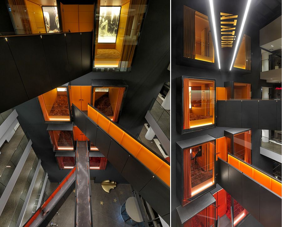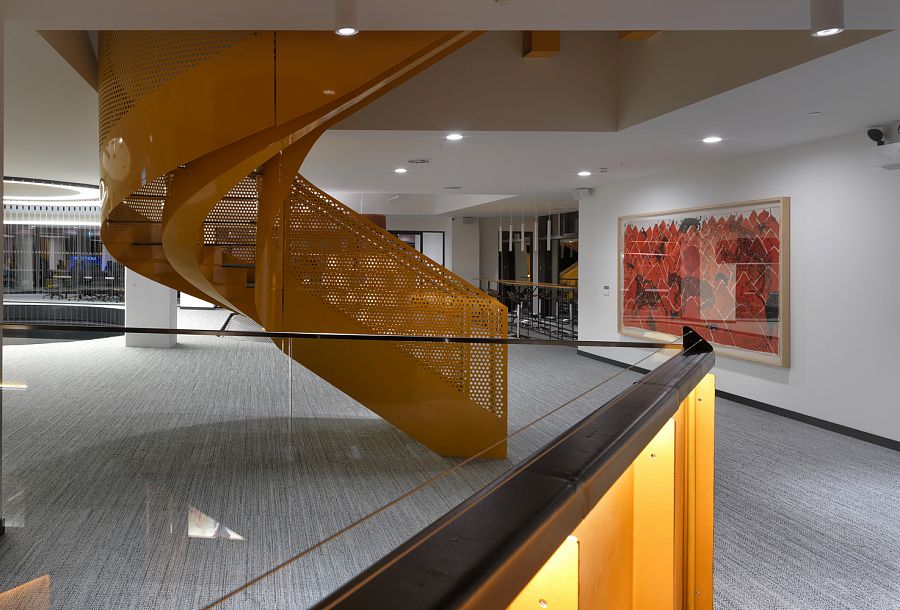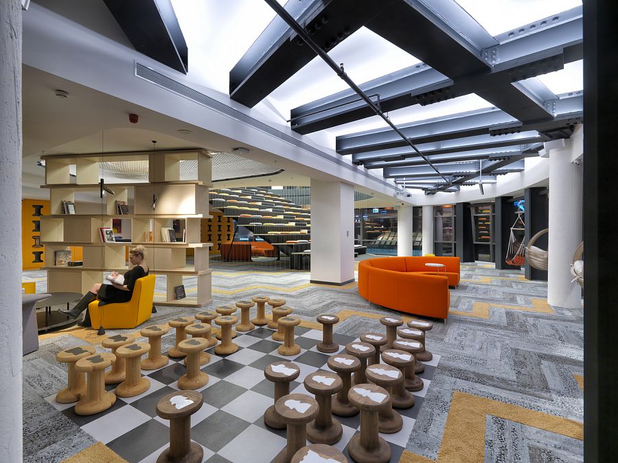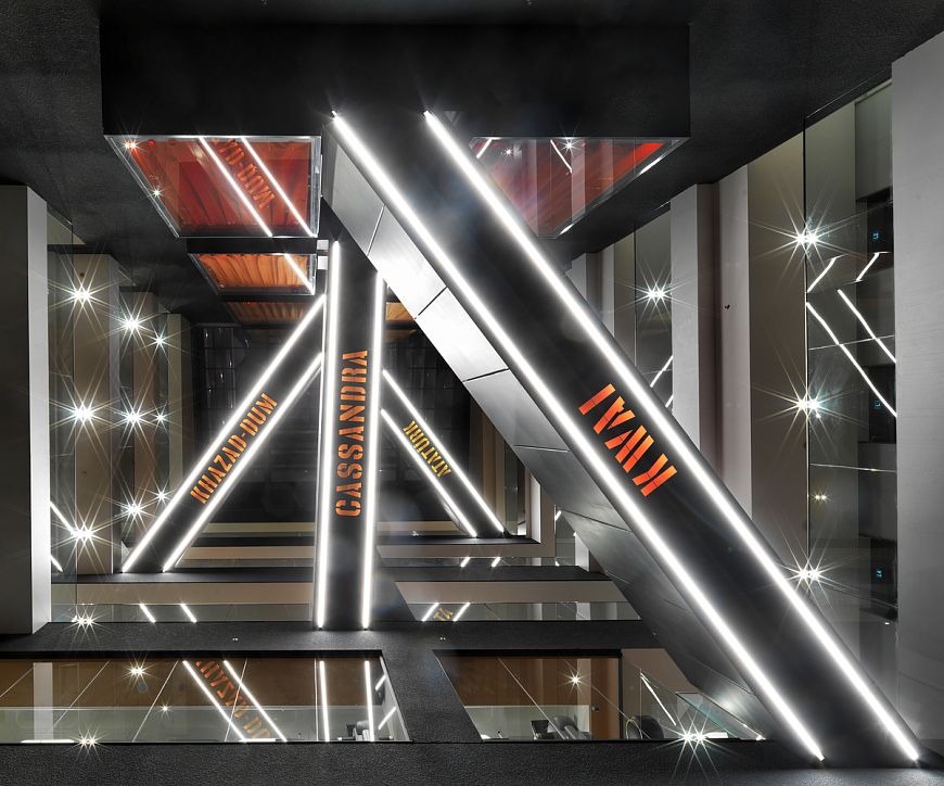 Первое, что бросается в глаза на входе, - просторная галерея высотой в пять этажей с пятью застывшими в воздухе мостами. Каждый мост имеет свое название и особое цветовое решение (от ярко-желтого до темно-красного), в качестве контрастного фона выступает матовый черный. Мосты связывают каждый этаж с уютной спальней в той же цветовой гамме. Концепция каждого этажа уникальна и была разработана в соответствии с потребностями отдела, который будет на нем размещаться.