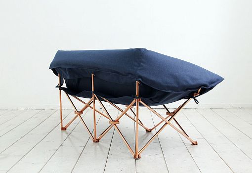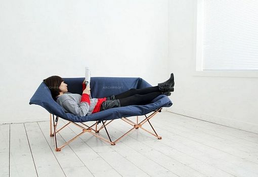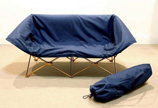 Молодые кореянки Со Хёнчин (Seo Hyunjin) и Ким Джэкён (Kim Jaekyoung) пять лет назад закончили отделение мебельного дизайна Сеульского университета Hongik. За это время они успели поработать на разные компании, поучиться в Европе, принять участие во множестве выставок, получить несколько наград и создать собственную студию под названием Kamkam. На миланскую выставку Salone Satellite девушки привезли уникальный раскладной переносной диван Kamp. Модель состоит из двух частей: отдельная мягкая верхняя часть, которую можно скатать в рулон и сложить в сумку, и складное металлическое основание, которое сдвигается-раздвигается по принципу пантографа - в сложенном виде оно очень компактно и легко помещается в небольшой цилиндрический чехол. Размеры дивана в разложенном состоянии 170х70х73 см. Авторы позиционируют свою разработку как ситуативно используемый временный предмет мебели или как диван для приверженцев модного «кочевого» образа жизни.