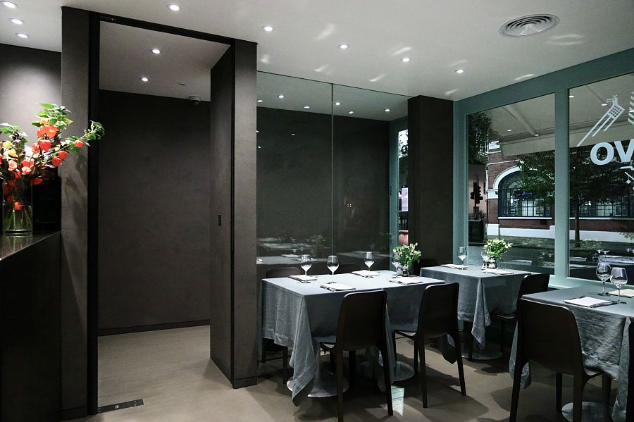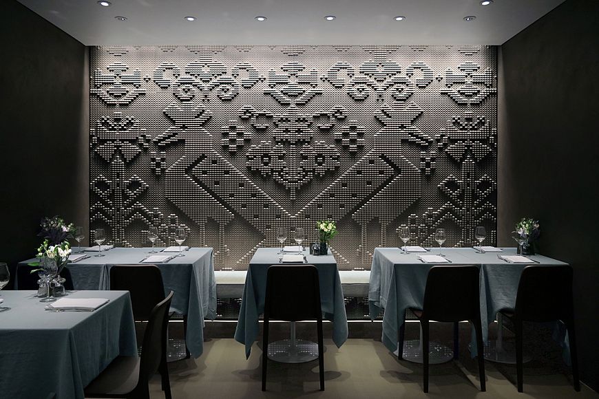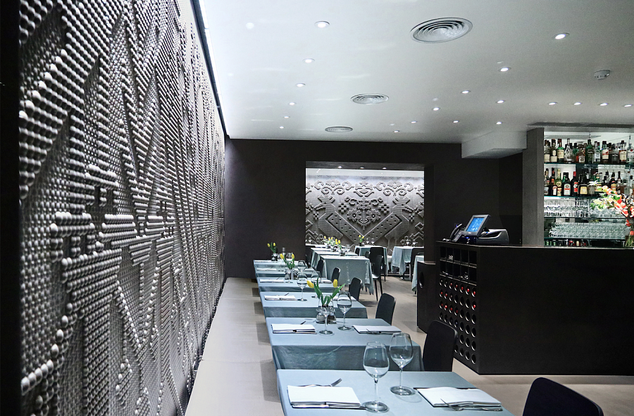 Главный декоративный мотив обновленного интерьера – барельефы, выполненные из натурального камня. Они повторяют формы и сюжеты традиционных самотканых ковров из Сардинии с рельефным рисунком в виде небольших круглых петелек. Глухая стена, которая ранее отделяла обеденный зал от улицы, была демонтирована и заменена на стеклянную. Все помещения оформлены в теплых тонах.