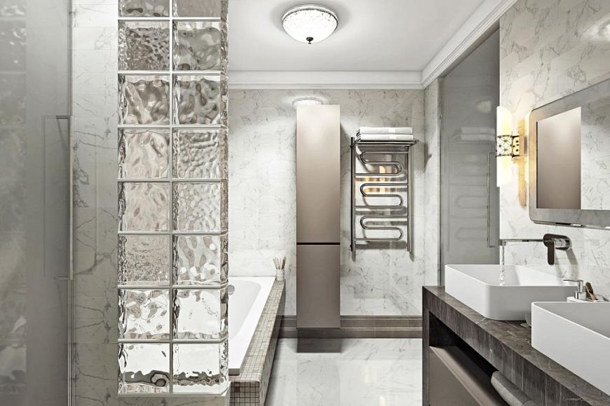 Стеклоблоки - это очень интересный материал! Рельефное стекло не может не привлекать взгляд. Мы спроектировали стену, отделяющую нишу для стиральной машины с полками для технического хранения и ванную чашу. Я решила облегчить эту стенку, расположив только два ряда