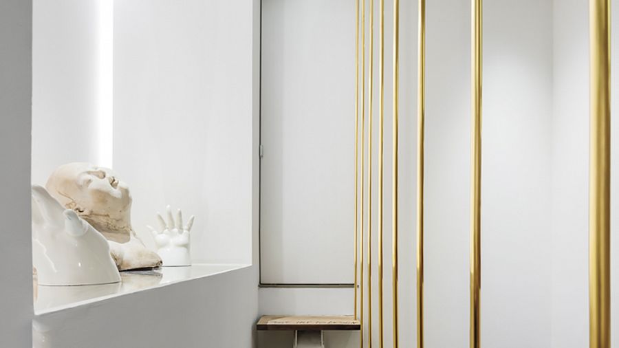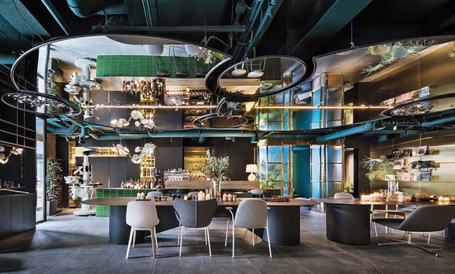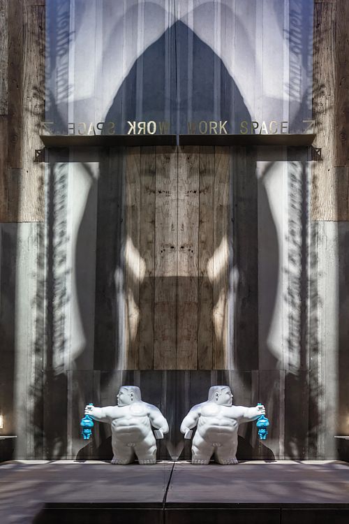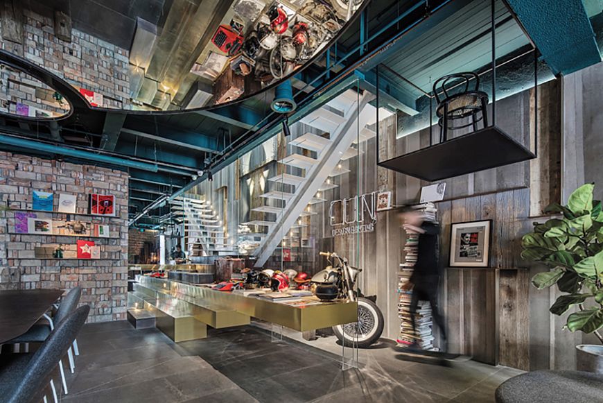 Новый офис расположен в реконструированном промышленном здании постройки 80-х годов прошлого века. Мелкие интерьерные объекты играют важнейшую роль в этом проекте. На первом этаже прямо напротив входа запроектирован бар с частично зеркальным потолком, отражающим нагромождение предметов — мотоциклетных шлемов, книг, обрамленных фотографий и так далее. «Я попросил сотрудников принести в офис их личные вещи, чтобы персонализировать зону, которая предназначена для собеседования с клиентами, коротких «летучек» или проведения праздников», — рассказывает Куи Шу.