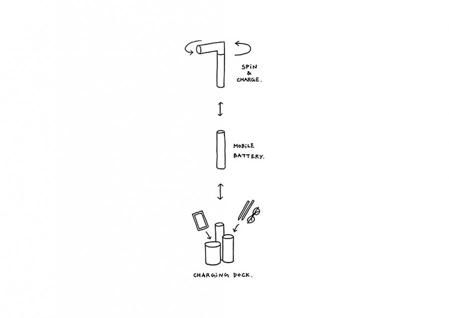 На ранних этапах проектирования дизайнеры хотели использовать энергию солнечных лучей и рукоятку для завода батареи, но позже отказались от этой идеи. Чтобы зарядить Denqul вручную, необходимо присоединить к основному элементу дополнительную секцию – так получается L-образная конструкция, которую и нужно вращать. Кроме того, трубчатые элементы аккумулятора при необходимости используют в качестве настольного органайзера или подставки для заряжающегося смартфона.