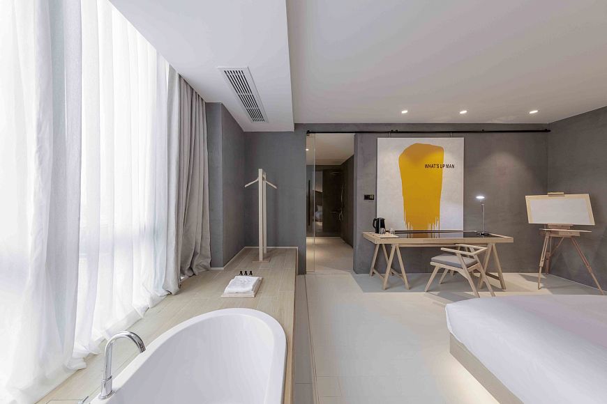Стоит зайти в помещение с ресепшеном отеля от студии X+Living в Шанхае и создается впечатление, что вы в музее современного искусства. Изготовленные на заказ скульптуры, мебель и изображения стали основой этого пространства.