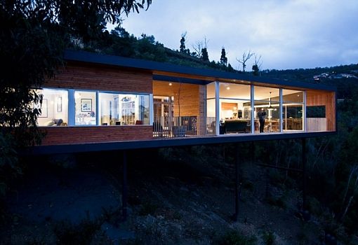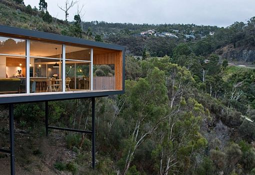 Highway House от архитекторов Room 11 Architects представляет собой огромную консоль, нависающую над пологим склоном в Тасмании (Австралия). Сооружение покоится на сваях и отличается открытостью композиции, чего удалось достичь благодаря созданию практически полностью остекленных фасадов. Современный интерьер дома изобилует естественными материалами.