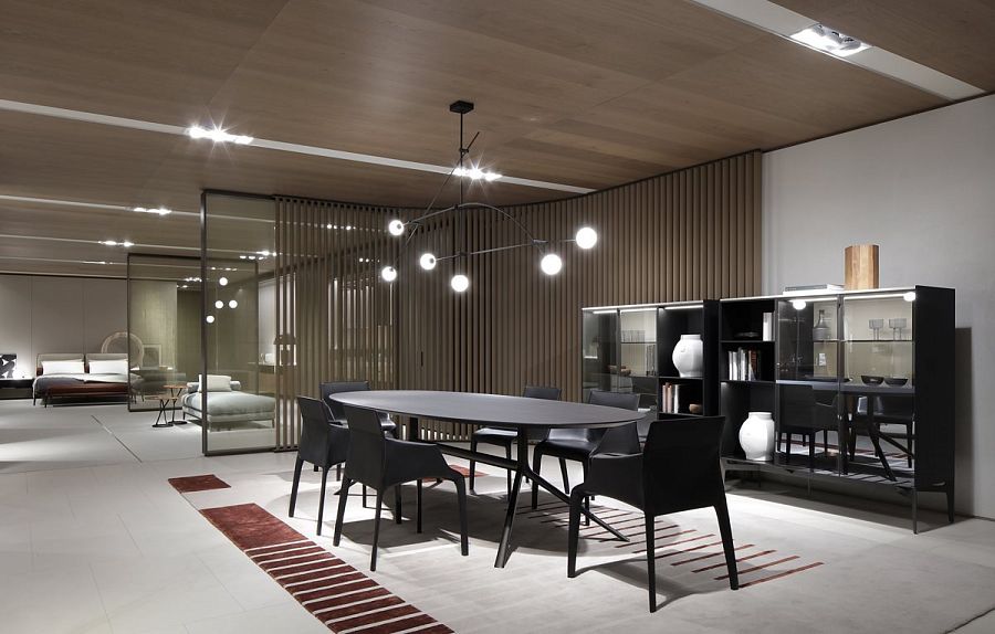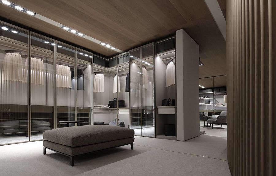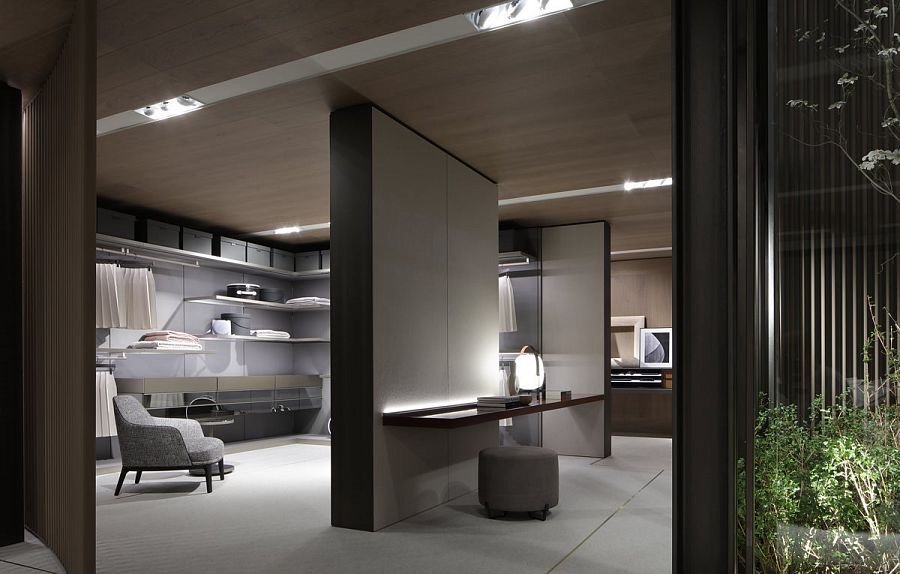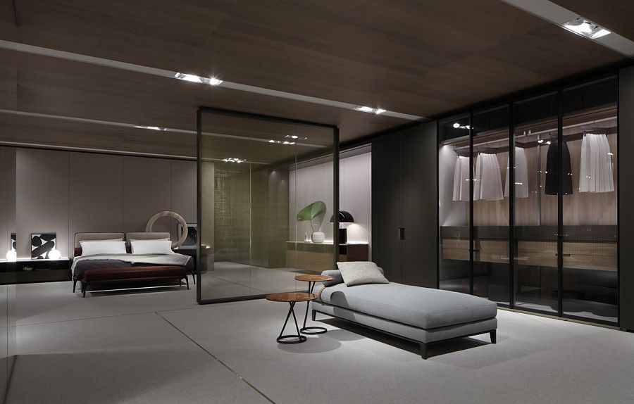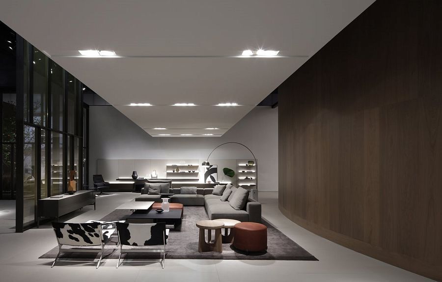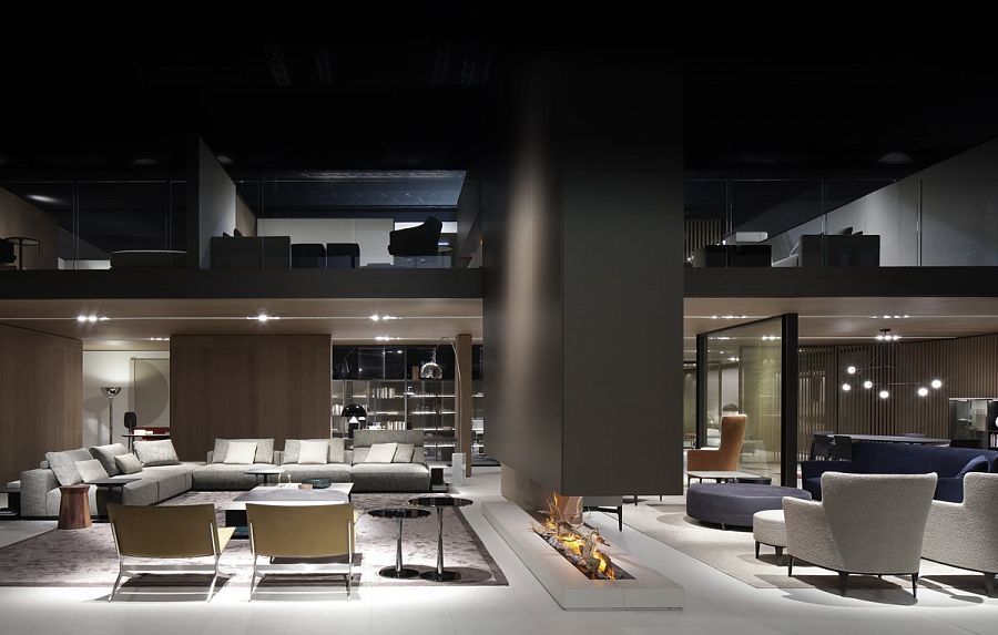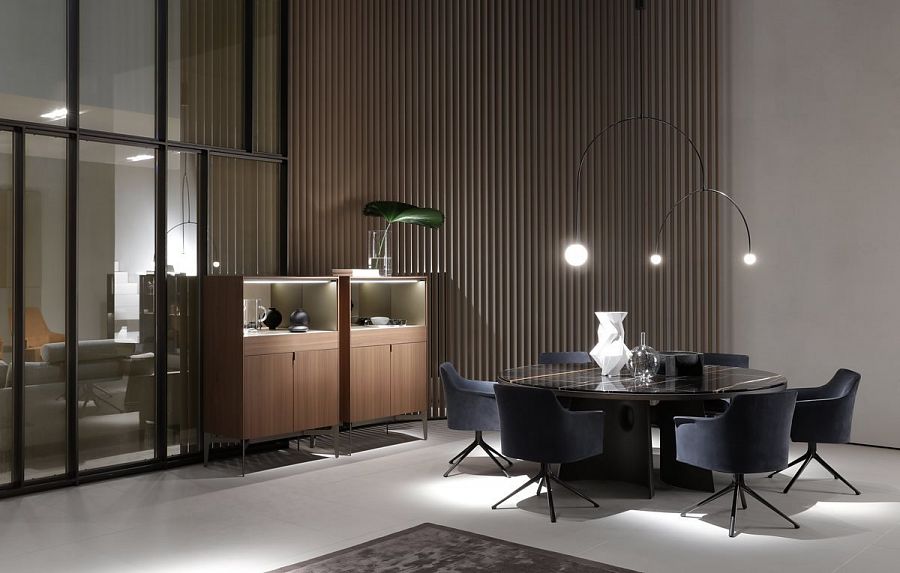 Главный центр притяжения и общения – велком-зону – разместили на круглой «пьяцце», своего рода центральной городской площади этого роскошного «поселения». Она открывала проход к череде сменяющих друг друга гостиных, столовых, спален, гардеробных, лаунжевых и кабинетных зон. И несмотря на обилие разнообразной мебели из разных коллекций, ни разу не возникло даже намека на диссонанс, поскольку стилистика марки виртуозно «заточена» под создание гармоничных концепций полной меблировки любого объекта.
