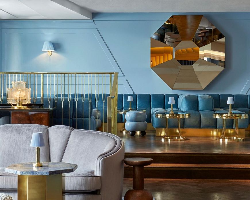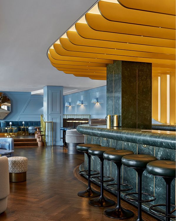 Дизайнеры британской Lore Studio спроектировали интерьер бара Lyaness в известном лондонском отеле, придав ему стилистику внутреннего пространства круизного лайнера «позолоченного века». «У пространства бара было два явных преимущества. Во-первых, «театральность» главного многоуровневого зала. Во-вторых, панорамный вид на Лондон и берег Темзы», — так обозначают дизайнеры опорные точки концепции.