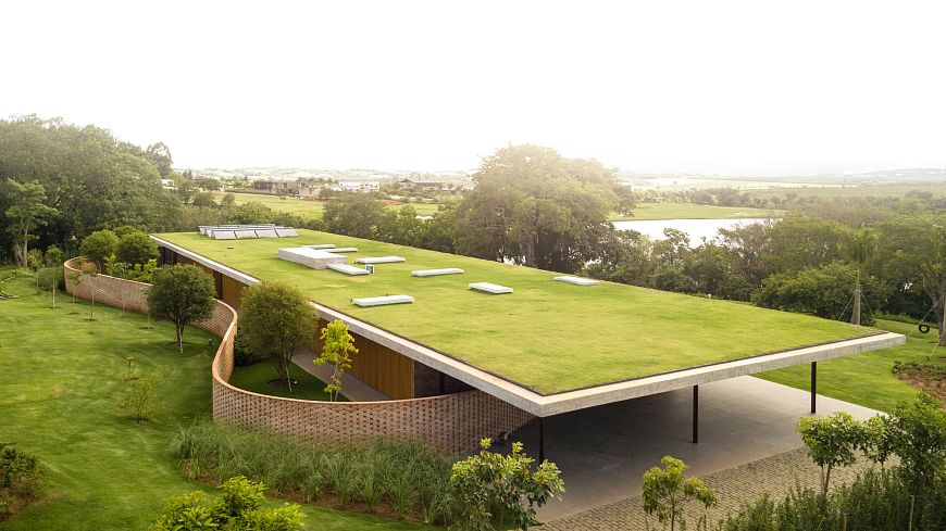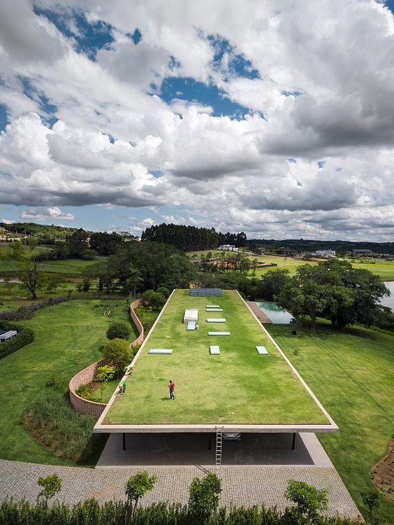 Главной особенностью нового проекта архитекторов Studio MK27 стала роскошная зеленая трава, полностью покрывающая бетонную кровлю минималистичной резиденции Planar House в Бразилии.