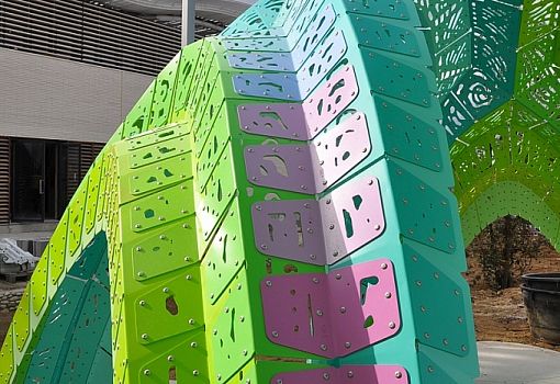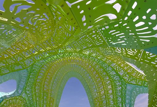 Конструкция выполнена из перфорированного алюминия и состоит из 990 деталей, образующих воздушный «плиссированный» амфитеатр с множеством арок. Перфорация и сама необычная форма архитектурного объекта порождают игру света и тени, причудливые узоры на бетонном покрытии пола. Зеленые, голубые и розовые оттенки Pleated Inflation проникают друг в друга, образуя градиент.