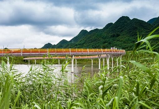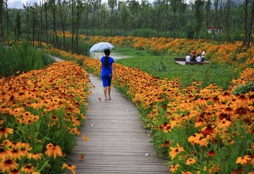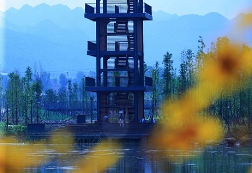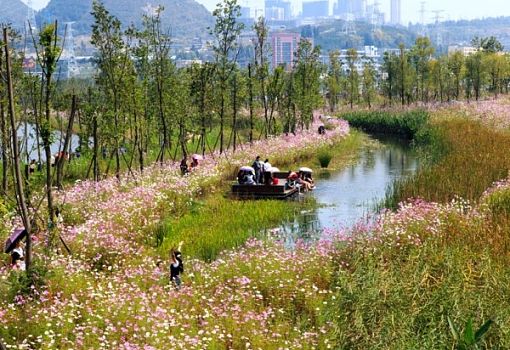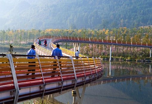 Китайский город Люпаньшуй в провинции Гуйчжоу – это промышленный мегаполис с высоким уровнем загрязнения воздуха. Через город протекает река Чжучжоу, которая усилиями промышленников практически превратилась в сточную канаву.Однако в рамках кампании по улучшению состояния окружающей среды в городе органами местного самоуправления был введен в эксплуатацию проект регенерации реки и ее бассейна. В результате в Люпаньшуе появился национальный ландшафтный парк. Специалисты пекинского бюро ландшафтного дизайна Turenscape преобразовали заброшенный участок болотистой местности площадью более 90 га в живописный природный парк с извилистыми оранжевыми дорожками, нависающими над водой и удерживающимися прочными бетонными сваями. На береговой платформе красуется смотровая башня, откуда открываются превосходные виды. Цветы и травы удерживают ил на дне, любители рыбалки могут посидеть у реки с удочками, пешеходные и велосипедные дорожки выглядят среди этой природной красоты вышитым узором. Архитекторы расширили берега реки, так как ее русло было сужено в результате наводнения 1970 года. Они также запроектировали серию взаимосвязанных террасных бассейнов, которые остановили поток ливневых вод. Создатели парка рассчитывают, что этот проект значительно улучшит экологию региона.