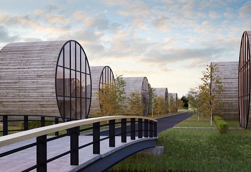 На Куршской косе в Литве скоро появится поселок, состоящий из цилиндрических трехуровневых домиков, уложенных на боковые поверхности, горизонтально. Фасады деревянных конструкций Rolling Homes (основания цилиндров) остеклены для проникновения в дома солнечных лучей. Проект вильнюсского бюро DO Architects.