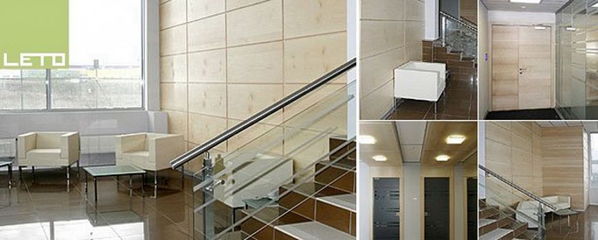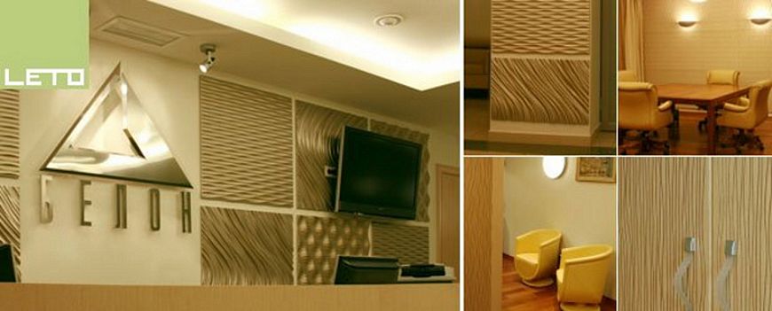 Офисы руководства оформлены при помощи рельефных 3D панелей LETO, произведенных по индивидуальному эскизу заказчика. Панелями отделаны многометровые стены кабинетов и приемных, в которых встроены такие же рельефные двери с перетеканием рисунка с двери на стены. Архитектор Сергей Эстрин создал эффект некой монохромности, сделав полностью «черные» и «белые» кабинеты (при использовании панелей в черной и белой матовой эмали). Также, компанией LETO по проекту Сергея был оформлен зал для конференций (акустические панели NASTRO Acoustic).