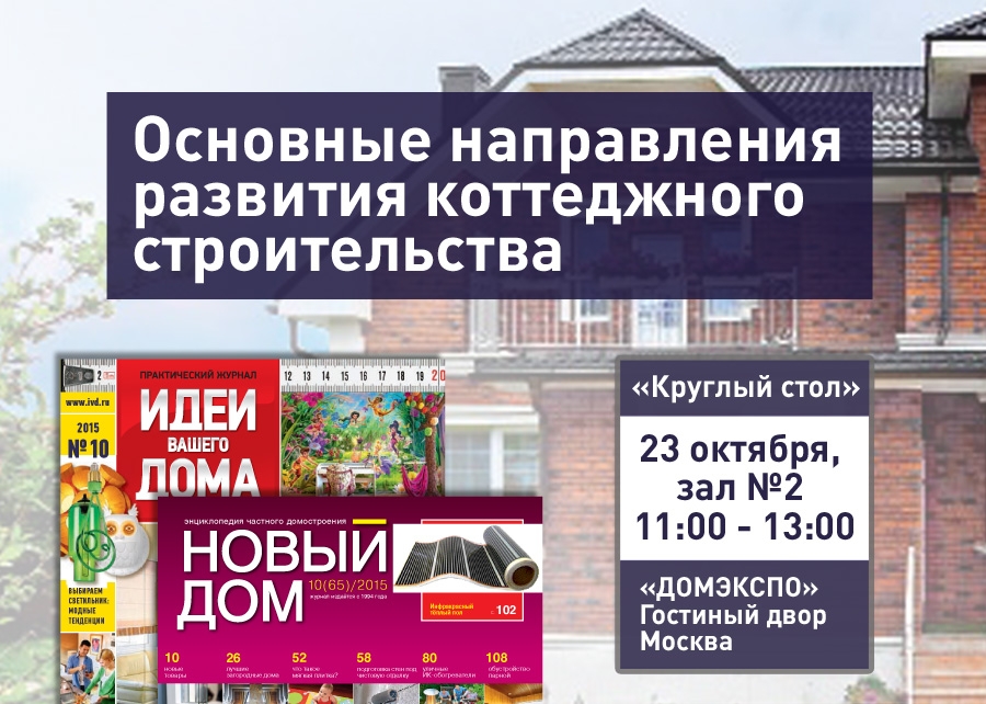 Сотрудники редакций журналов «ИВД» и «Новый дом» примут участие в дискуссии «Состояние и основные тенденции на рынке загородной и зарубежной недвижимости». «Круглый стол», подготовленный ИД «Бурда», называется «Основные направления развития коттеджного строительства». Он пройдет 23 октября, в пятницу, в зале №2 с 11:00 до 13:00. По словам организаторов, признанные эксперты в своей области поделятся секретами и стратегиями выживания в кризисное время, расскажут об успешных практиках и основных трендах развития рынка малоэтажной загородной недвижимости.