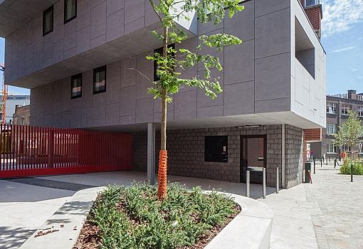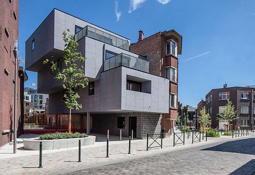Бюро B-Architecten разработало проект, призванный стилистически «разбавить» городской ландшафт одного из районов Брюсселя. В границах архитектурного оазиса Zennetuin на площади 365 кв. м, кажется, сохраняется хрупкое равновесие трех прямоугольных блоков, смещенных относительно друг друга. Неординарная концепция подчеркнута контрастными деталями, например, ярким ограждением и окружающими зданиями с элементами индустриального стиля.