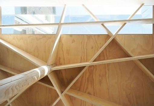 Большая площадь остекления и зенитные окна позволили наполнить интерьер дома Daylit динамичными контрастами света и тени. Архитекторы бюро Atelier Vens Vanbelle использовали дерево для создания опор в виде колонн и оригинальной конструкции навеса из пересекающихся досок. Таким образом была реализована идея прогулки по осеннему лесу, где свет пробивается сквозь облетающие кроны деревьев. При этом роль опавших листьев выполняет плитка на полу из разноцветных шестиугольников. Расположен дом в Генте (Бельгия).