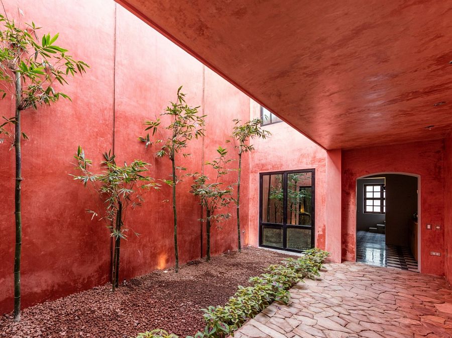 На плане видно, что авторы соединили оригинальную и новую части постройки при помощи патио. Новая часть представляет собой прямоугольный объем с полукруглым отверстием в верхней части. Благодаря этому люку и винтовой лестнице появилась вертикальная пространственная ось. Сквозь вырез в крыше в домашний сад попадают воздух и солнечные лучи. После реконструкции площадь здания составила 275 кв.м.