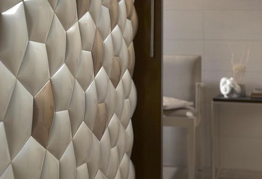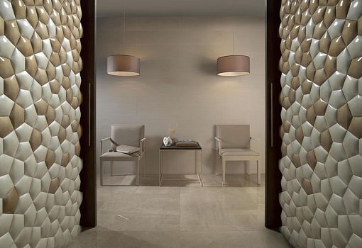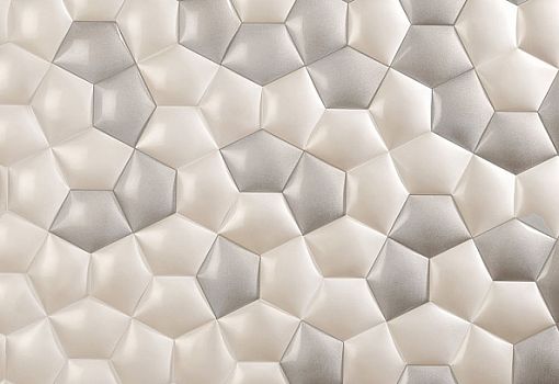 Мадридская студия DSIGNIO создала керамическое настенное покрытие, в дизайне которого отражены математические закономерности. Отличающиеся цветом выпуклые пятигранные элементы образуют шестигранные, геометрически правильные узоры. Покрытие Kin позволяет моделировать интерьер, придавая ему структуру и добавляя игру света и тени в пространство.