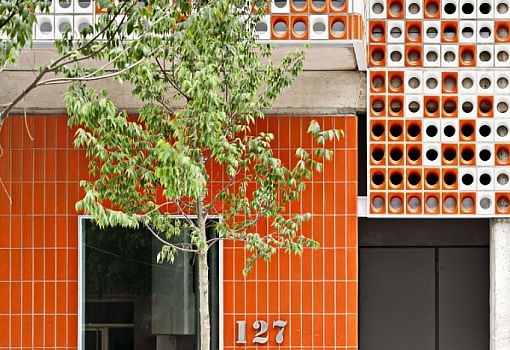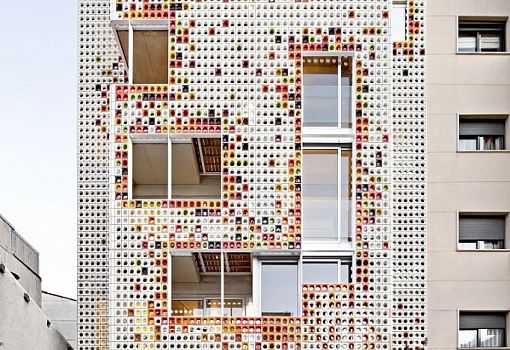 Керамическая плитка необычной формы использована архитекторами Lagula Arquitectes для оформления фасадов многоквартирного дома в Барселоне (Испания). Если первый этаж облицован яркой оранжевой плиткой, то остальные три экранированы элементами с отверстиями, которые регулируют интенсивность естественного света и сберегают частную жизнь жильцов. Неординарная форма и яркие «пятна» позволили дому органично вписаться в окружающую модернистскую архитектуру. Для подъема на этажи используется винтовая лестница.