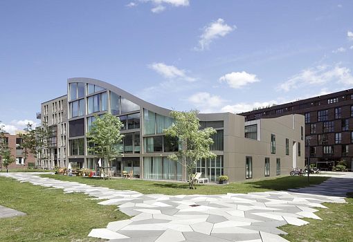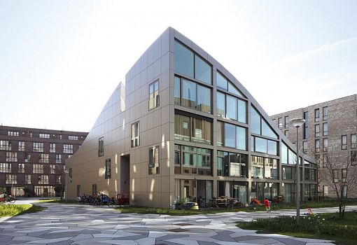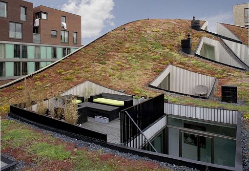Бюро NL Architectsспроектировало в бывшей промзоне Амстердама несколько домов с озелененными кровлями. Высота построек варьируется от 9 до 18 метров. Самая яркая отличительная особенность жилых объектов заключается в волнообразно изогнутой крыше. Если подняться на нее, то перед вашим взором окажется холмистая местность, поросшая травой и маленькими кустарниками. Общая площадь третьего этажа делится пополам: 50% отдано ландшафту и 50% относится к жилой территории.