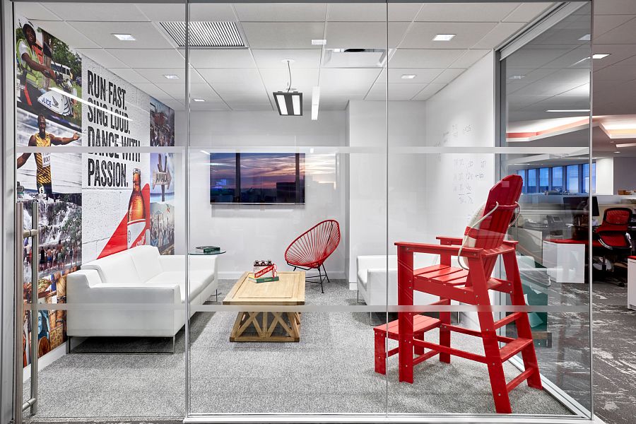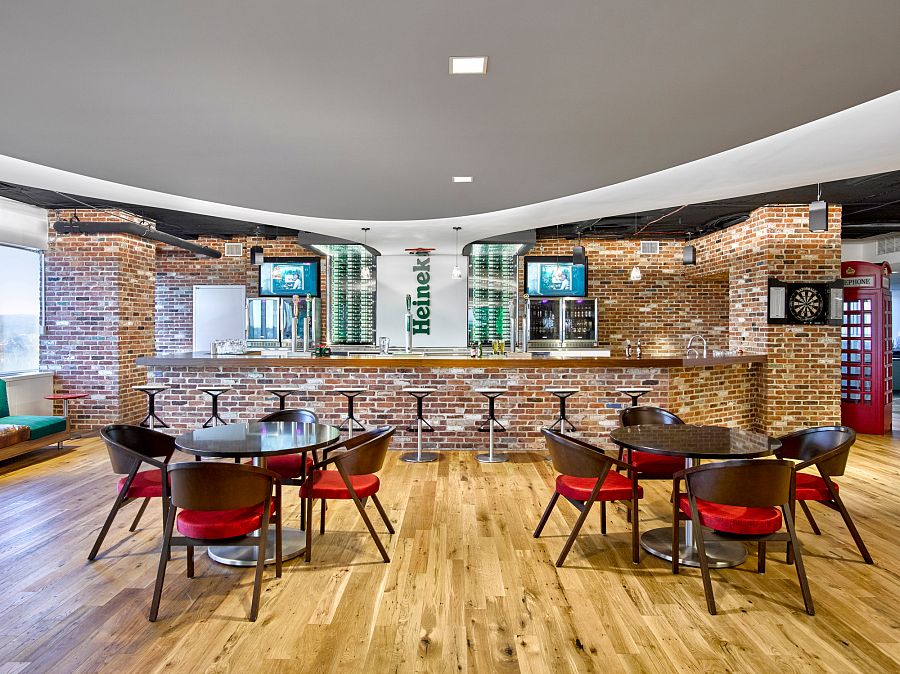 В функциональной схеме офиса главную роль играют брендированные и украшенные крупными графическими символами переговорные, а также зона бара (кафе), запроектированная в центре первого этажа. Кафе развернуто по направлению к главной лестнице, основание которой окружено ступенчатыми конструкциями из белого дуба. Это и есть «территория взаимодействия» со свободной рассадкой. Зона бара ограждена стеной из натуральных кирпичей, оставшихся после сноса старых зданий в историческом центре Нью-Йорка.