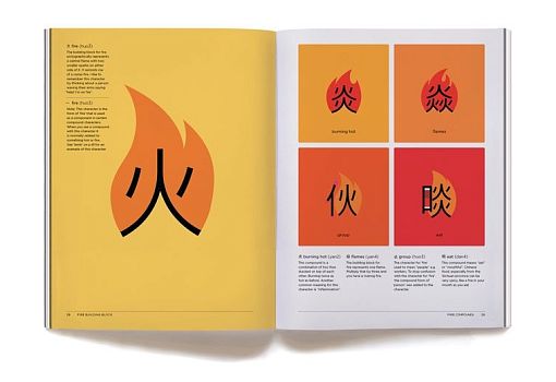 Приведем небольшой пример. С помощью исходного «простого» значка 火 («огонь») образуется как сложное понятие 炎 ,то есть «жарко гореть», так и «строительный блок» 火山, означающий «вулкан». Несложно заметить, что последняя графема состоит из иероглифов «огонь» и «гора». Более подробно система описана в книжке, выпущенной издательством Thames & Hudson Ltd. и на сайте www.chineasy.org.