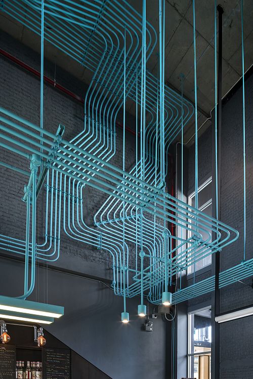 Система освещения и каналы с проводкой в интерьере объекта бюро Supermachine Studio стали композиционным центром. Динамичная инсталляция выделена бирюзовым цветом и образует целую сеть завораживающих линий, пересекающихся во многих точках.