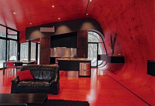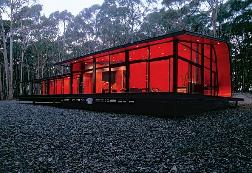 Дом под названием Wheatsheaf находится в Виктории (Австралия) на территории эвкалиптовой плантации. Динамичная конструкция в экстравагантном цветовом исполнении была отстроена Judd Lysenko Marshall на месте старой конюшни (1830 год). Свернутое «полотно» фасада полностью застеклено с одной стороны – этот прием помогает подчеркнуть контраст черного экстерьера и ярко красного интерьера (окрашеной фанеры). В ночное время со включенной подсветкой здание напоминает огнедышащий уголь.