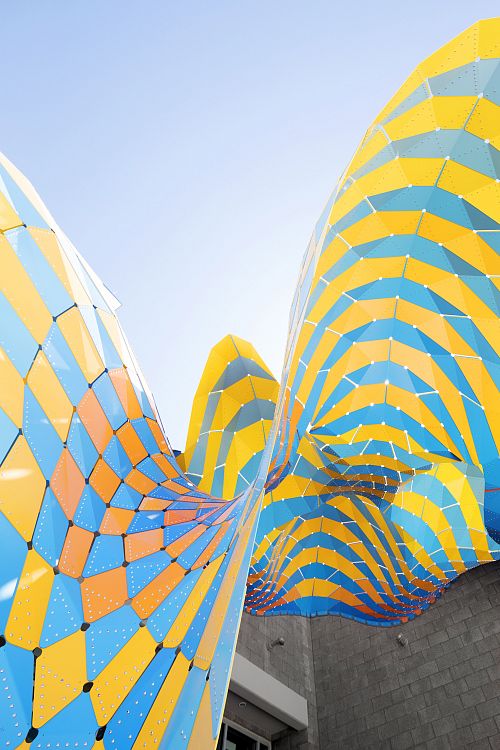 Конструкция состоит из сотен легких алюминиевых панелей, соединенных между собой с небольшими промежутками, чтобы пропускать свет. Панели образуют волнообразный самоподдерживающийся навес, который защищает посетителей от солнца и дождя. Всего в конструкции 240 панелей голубого цвета, а также 280 панелей различных тонов желтого. Для внутренней поверхности павильона был использован паттерн в полоску, панели на внешней стороне расположены в шахматном порядке.