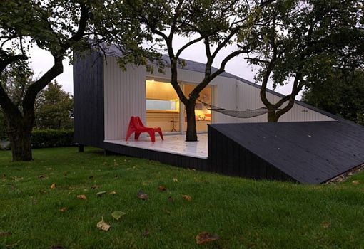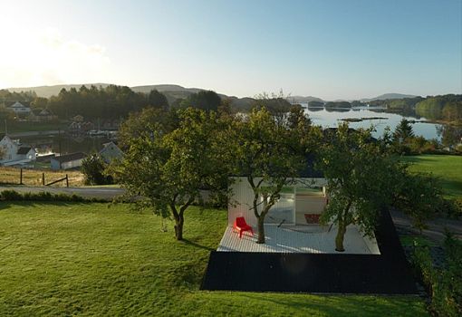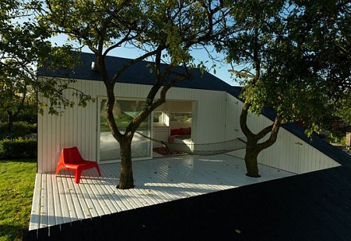 Кусок буквально вырезан из объема жилого дома Slice House (Норвегия), спроектированного Saunders Architecture. Так получилось уютное патио, окрашенное в контрастный белый цвет. В композицию вплетены природные мотивы: сквозь деревянный настил «прорастают» две яблони.