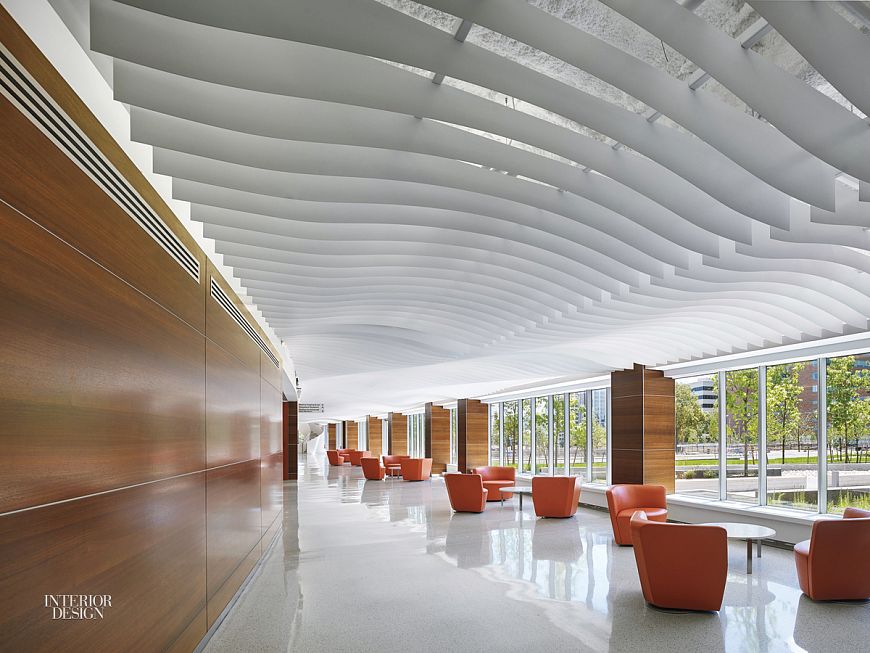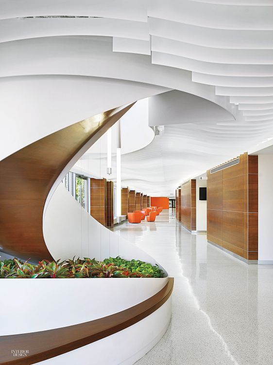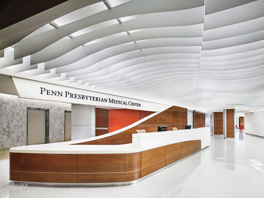 Сложно придумать что-то более функционально обусловленное, чем интерьер лечебного учреждения. Удачные «больничные» интерьеры встречаются довольно редко, но когда встречаются, спутать их невозможно ни с чем. Пример – Пресвитерианский медицинский центр Пенна в Филадельфии, спроектированный местным бюро EwingCole. В основе архитектурной концепции лежит образ открытой веранды, продуваемой свежим морским ветром. Для отделки помещений архитекторы использовали шпонированные панели и алюминиевый лайнинг. Основной цвет внутренних пространств – белый. Используют авторы также и прием контраста. К примеру, яркая мебель в фойе контрастирует со спокойной отделкой. Интересный элемент фойе – стойка рецепции с меняющейся высотой.