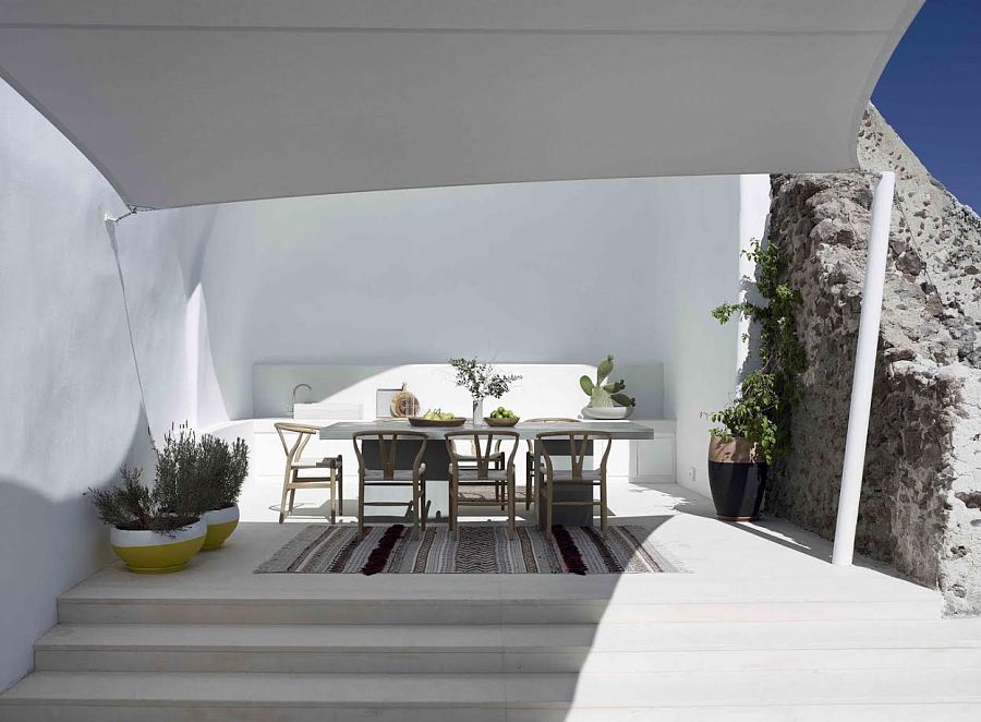 Архитекторы бюро Kapsimalis Architects построили летнюю резиденцию на острове Санторини (Греция). Он состоит из двух объемов. Первый целиком заглублен в вулканическую породу и снаружи практически не виден, а второй являет собой навершие всей конструкции.