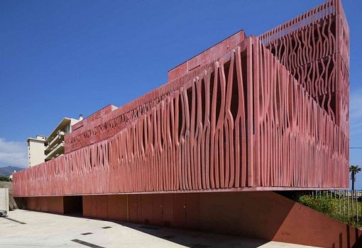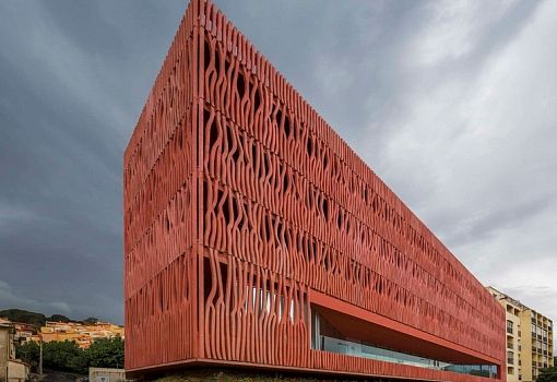 Лейтмотивом фасада Международного центра океанологии стали кораллы – Gorgones. Архитекторы Atelier Fernandez & Serres окрасили сооружение в цвет охры, что выделяет его на фоне застройки вблизи морского заповедника Cerbères-Banyuls (Франция). Объем сооружения отличает динамика, которая проявляется как в изгибах самих элементов фасада, так и игре теней, которую они создают.