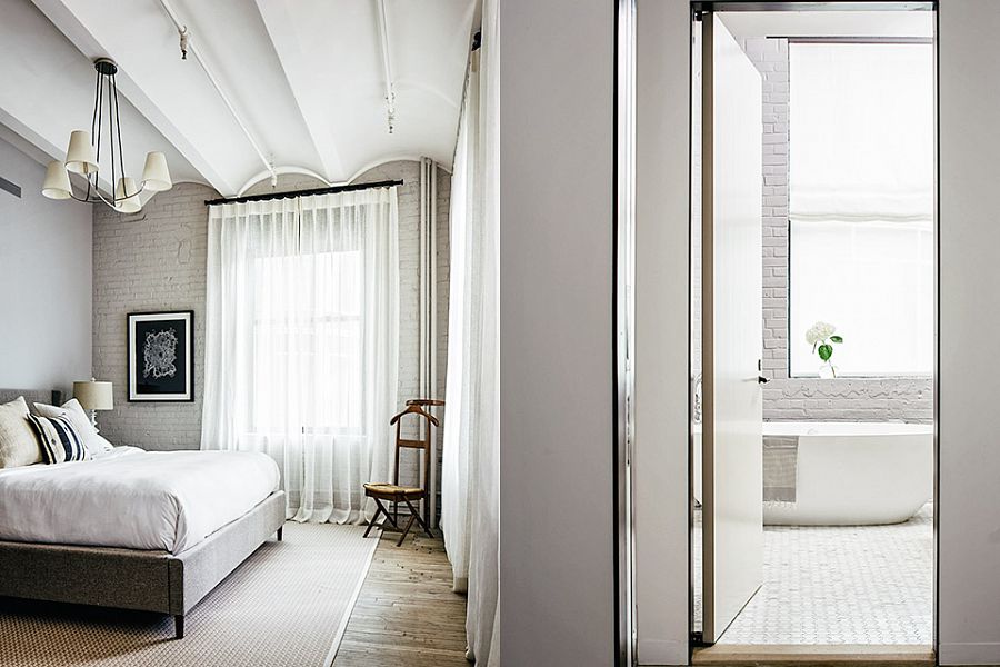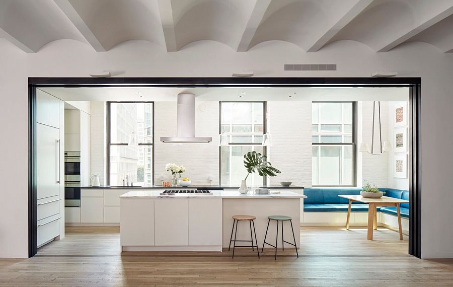Они снесли все внутренние стены и в итоге получили открытый этаж с четырьмя спальнями. Дизайнеры сохранили существующие несущие чугунные конструкции и сделали их частью декора, дополнив темными стальными дверями и отделкой. Дверь в кухню, выполненная из стекла и стали, тоже вписывается в эту стилистику. Кленовые полы и своды потолка были отполированы, что усиливает впечатление.