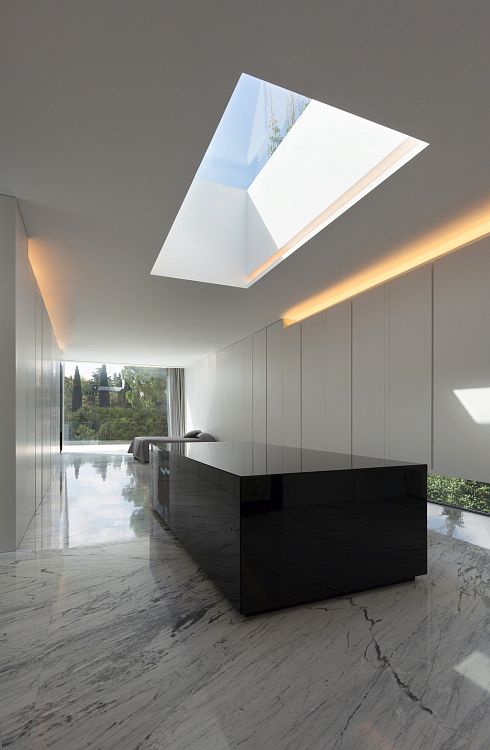 Сочетание камня, металла и мрамора и минималистский дизайн – этими особенностями отличается дом, спроектированный бюро Fran Silvestre Arquitectos. Расположен он в Мадриде. Архитекторам хотелось, чтобы здание казалось меньше, чем есть на самом деле. Поэтому из-за выступающей металлической конструкции дом кажется одноэтажным.