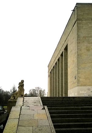 Эти блоки слева справа симметричны конечно центральной оси фасада являются вентиляционными блоками для метрополитена в районе станции Пушкинская и боардами для размещения театральной афиши. Это центр Петербурга. Памятник модернизма. И такое убогое состояние.