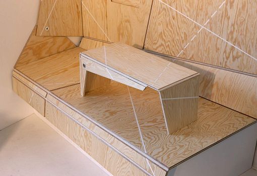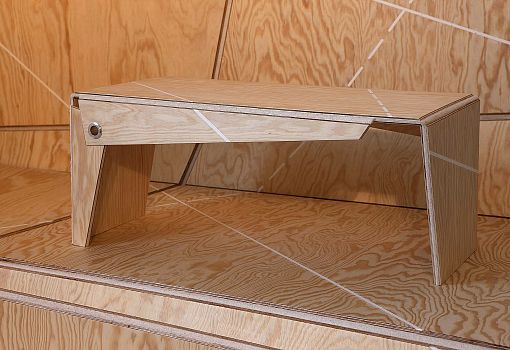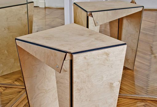 Коллекция Plie (два стола, тумба и табурет) – результат двухлетних технологических экспериментов студии atelierarchitects, которую возглавляет Гергей Киш-Гал (Gergely Kiss-Gal). Название коллекции (от фр. «plier» - «складывать, сгибать») отражает суть процесса: мебель выкраивается из плоского листа и складывается по сгибам. Лист – специально разработанная ламинированная слоистая панель - гибкая, но прочная комбинация из нескольких пластов различных материалов.