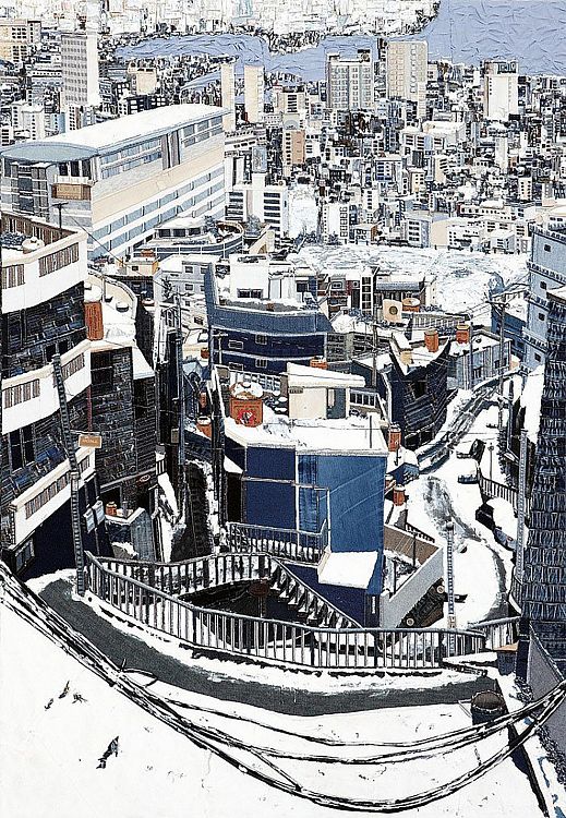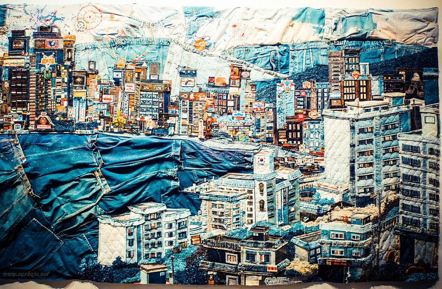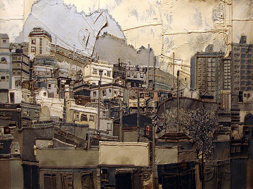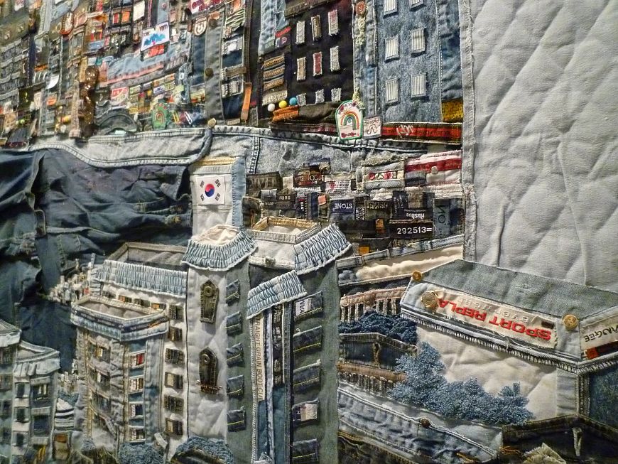 Коллаж из джинсы, перо.