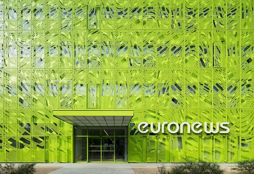В средней части здание «прошивают» два больших отверстия – «глаза». Ярко-зеленый узор, покрывающий фасад, создан французским художником Фабрисом Ибером, который часто использует оттенки зеленого в своих работах. Шестиэтажное здание имеет остекленный фасад, пропускающий внутрь много света. Внутри, помимо офисов «Евроньюс», есть ресторан, студии звукозаписи и мультимедийные пространства.