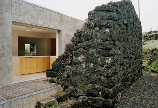 По заказу одной пары из Лиссабона (Португалия) на островке посреди Северной Атлантики появился необычный домик для отдыха. Архитекторы SAMI Arquitectos провели работу по интеграции современного жилища в руины старого сооружения. В пространство, которое частично ограничено полуразрушенными базальтовыми стенами, встроен объем домика CASA E/C. Террасы выходят за пределы пространства, ограниченного стенами оригинального здания, что выгодно подчеркивает сочетание старого и нового. Дизайнеры сделали основную ставку на естественное освещение и открытые пространства.