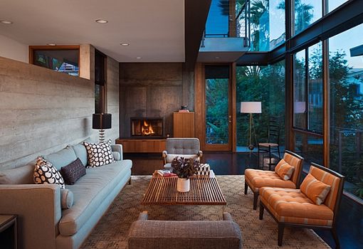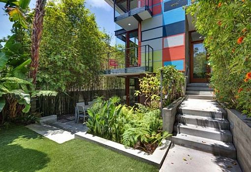 Фасад дома 2007 года постройки обновила художница Нэнси Монк. Бетонная конструкция от R&D Architects приобрела яркую динамичную окраску и яркие элементы облицовки. На площади в 1067 кв.м. эклектичный дизайн интерьера демонстрирует контраст белых стен и потолков с деревянным полом, индустриальные, модернистские и ретро-мотивы. Калифорнийский дом окружен буйной растительностью, которой тоже уделено место в проекте.