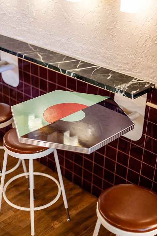Любопытно, что плитка используется для визуального разграничения функциональных зон. Так, цоколь центральной скругленной барной стойки облицован плиткой винного цвета. А дальняя часть бара отделана пестрой узорчатой плиткой. Архитекторы искали интерьерные объекты для нового заведения в антикварных магазинах, на ликвидационных распродажах, в Интернете у коллекционеров. Например, стойка бара когда-то была старинным комодом с травертиновой столешницей. Емкость для охлаждения вина — огромной промышленной раковиной из нержавеющей стали. А разноцветные фонарики в свое время освещали старый склад.
