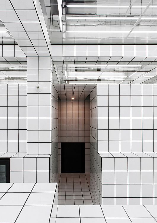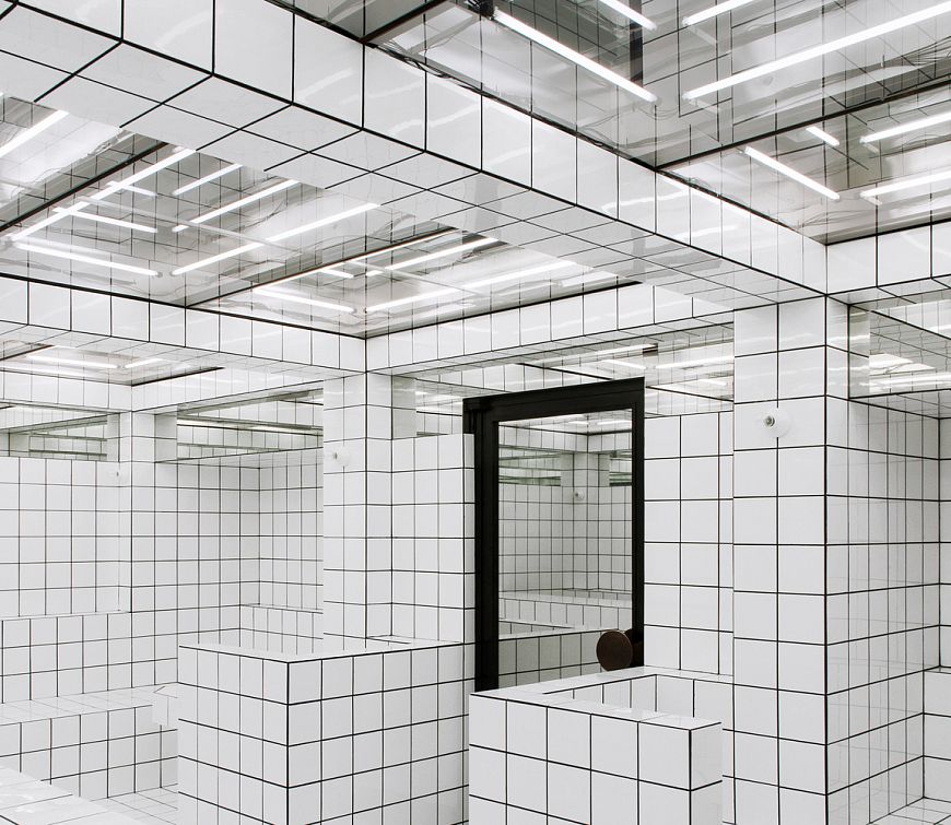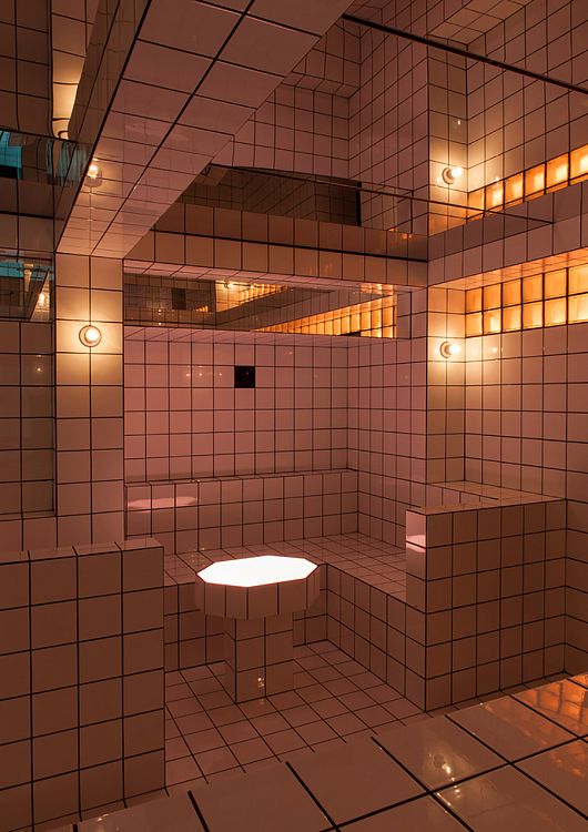 Главная особенность внутреннего пространства заключается в том, что стены, полы и все предметы мебели облицованы керамической плиткой, а зеркальный потолок снабжен подсветкой из неоновых трубок.