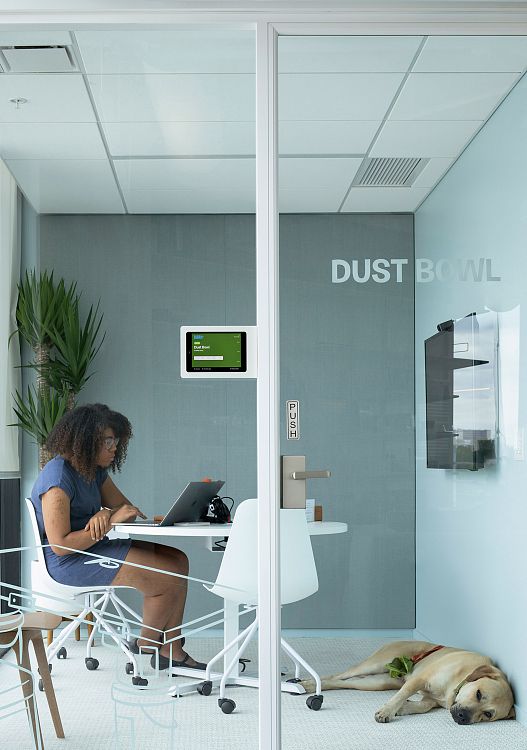 Общая площадь офиса, отделанного прочными и долговечными материалами, составляет чуть больше 2000 кв.м. Здесь есть много зон для работы, социализации, игры, а вот привычных стационарных столов нет. Вместо них дизайнеры установили передвижные «рабочие станции» со встроенными местами для животных. На входе сооружена система хранения по авторским чертежам, установлен дисплей для демонстрации зоотоваров.