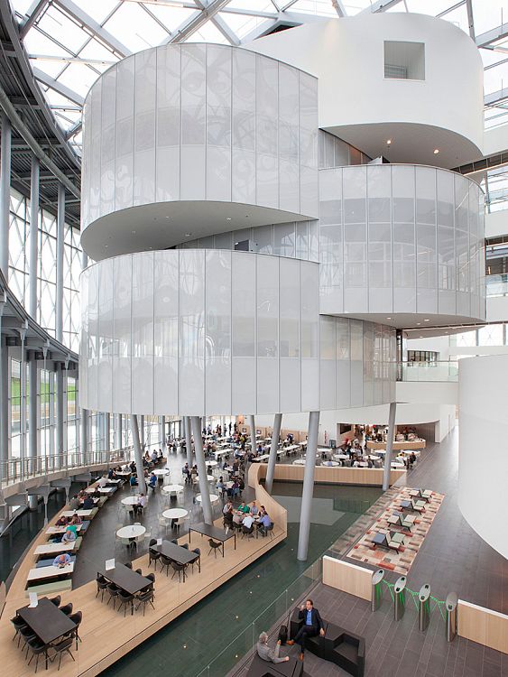 Полностью остекленный фасад округлого строения гарантирует хорошую естественную освещенность внутренних помещений. Разработчики также позаботились и о системе охлаждения. Проект Jaspers-Eyers Architects получился функциональным и стильным.