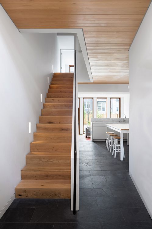 Двухсветная входная зона отделана деревом, а пол на кухне выложен серой керамической плиткой. Столешницы здесь мраморные. Таким образом, авторы проекта использовали в дизайне принцип контраста. На втором этаже запроектирована гостиная, три спальни и ванная комната. На третьем — спальня хозяев с гардеробной и ванной комнатой, а также кабинет. Из спальни можно пройти в крытое патио с видом на линию горизонта Манхэттена. Остается добавить, что спортивный зал, бойлерная, гостевая комната, помещение для стирки и кладовая расположены на цокольном этаже, ниже уровня земли.