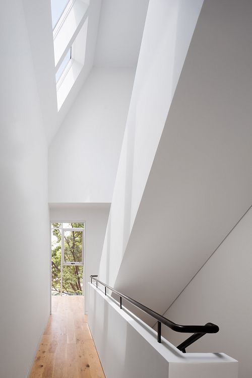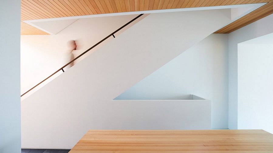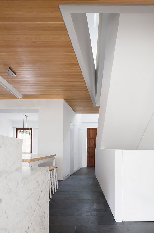 Архитекторы, очевидно, говорят о большом световом люке, прорезанном в надстроенном объеме. Действительно, благодаря этому элементу, выгодно отличающему обновленный таунхаус от соседних, интерьер стал значительно светлее.
