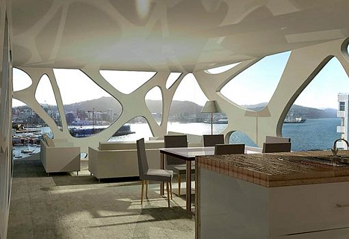 И еще о подражании природе. Инновационный проект Folly был предложен бюро archau для Новой Зеландии. Частное жилище в рендерах радует вплетением органических форм в композицию. Прямоугольная консоль, выстроенная в соответствии с особенностями ландшафта, является яркой архитектурной чертой будущей постройки. На создание подобного нетривиального элемента дизайнеров вдохновили просветы в кронах деревьев.
